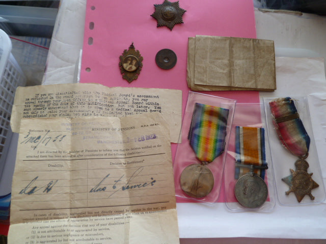great trio to a old contemptible s c/guards has cap badge some pesonal badge a half penny with bullet mark on it ?? some paperwork and nice original bar on 1914 star n/t 2248 pte r clinch c.gds. on all medals star has some vertigres on it and would need a clean up if desired